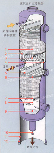 1、規整填料 2、支撐柵板 3、液體收集器 4、集液環 5、多級槽式液體分布器 6、填料壓圈 7、支撐柵板 8、蒸汽入口管 9、塔底 10、至再沸器循環管 11、裙座 12、底座環 此結構適合于直徑大于等于800mm的填料塔。 |