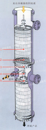 1、規整填料 2、支撐柵板 3、液體收集器 4、降液管 5、管式液體分布器 此結構適合于直徑小于800mm的填料塔。 |